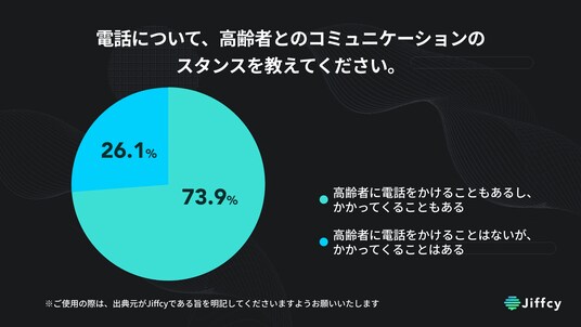 高齢者とのコミュニケーションでJiffcyを「使っている」と回答した方を対象に行った、「Jiffcyについて、高齢者とのコミュニケーションのスタンスを教えてください。」という質問に対して、74.1%が「高齢者にJiffcyをかけることもあるし、かかってくることもある」と回答しました。
