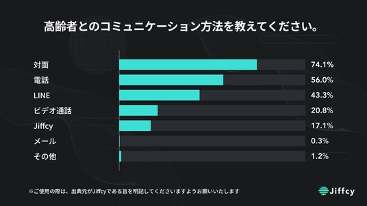 「高齢者とのコミュニケーション方法を教えてください。」という質問をしたところ、対面を除いて一番多かった回答は「電話」(56.0%)、続いて「LINE」(43.3%)、「ビデオ通話」(20.8%)「Jiffcy」(17.1%)となりました。