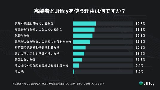 さらに、高齢者とのコミュニケーションでJiffcyを「使っている」と回答した方を対象に行った、「高齢者とJiffcyを使う理由は何ですか?」という質問に対して、最も多かった回答は「家族や親戚も使っているから」(37.7%)、続いて「高齢者がITを使いこなしているから」(35.8%)、「気軽だから」(32.1%)となりました。