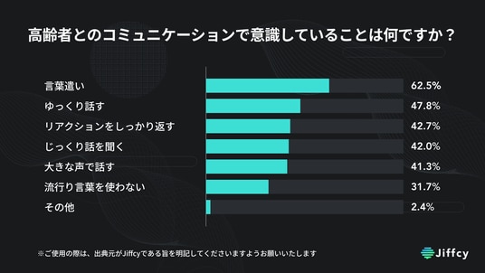 「高齢者とのコミュニケーションで意識していることは何ですか?」に対して、「言葉遣い」が62.5%になりました。一方で、「ゆっくり話す」が47.8%で、「リアクションをしっかり返す」(42.7%)よりも多いことがわかりました。