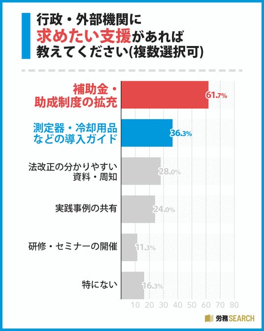 行政や外部機関に求めたい支援について聞いてみたところ、「補助金・助成制度の拡充」が61.7%と、他の選択肢を大きく引き離して最多となりました。しかし、2位以下の回答にも注目したいところです。「測定器・冷却用品などの導入ガイド」(36.3%)や「法改正の分かりやすい資料・周知」(28.0%)といった、具体的な情報提供へのニーズも非常に高いことがわかります。