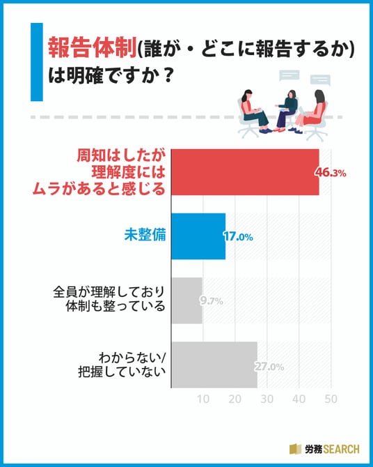 最も多かったのは「周知はしたが理解度にはムラがあると感じる」で46.3%にのぼり、ルールはあっても全従業員に浸透しておらず、いざという時に機能しない「形骸化」のリスクをはらんでいる状況が伺えます。