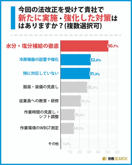 また、義務化された「作業環境のWBGT測定」を強化した企業は14.3%に留まっており、法改正の本質的な部分への対応よりも、まずは着手しやすい既存対策の強化に留まっているという傾向が見て取れます。