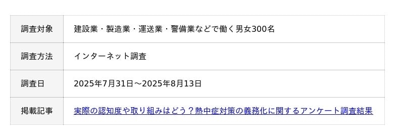 エフアンドエムネット株式会社(本社所在地:大阪府吹田市、代表取締役社長:上枝康弘)は、管理部門向けのビジネスメディア「労務SEARCH(労務サーチ)」にて、建設業・製造業・運送業・警備業で働く男女300名を対象に、熱中症対策の義務化に関するアンケート調査をおこないました。