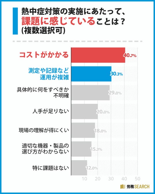 熱中症対策の実施にあたって課題に感じていることを尋ねたところ、1位は「コストがかかる」で40.7%にのぼりました。次いで「測定や記録など運用が複雑」が30.3%、「具体的に何をすべきか不明確」が29.0%と続き、金銭的な負担と実務的なノウハウ不足が二大障壁となっていることが明らかになりました。WBGT測定器や冷房機器といった初期投資だけでなく、消耗品の購入や管理・記録にかかる人件費といったランニングコストも大きな負担となっていることが伺えます。