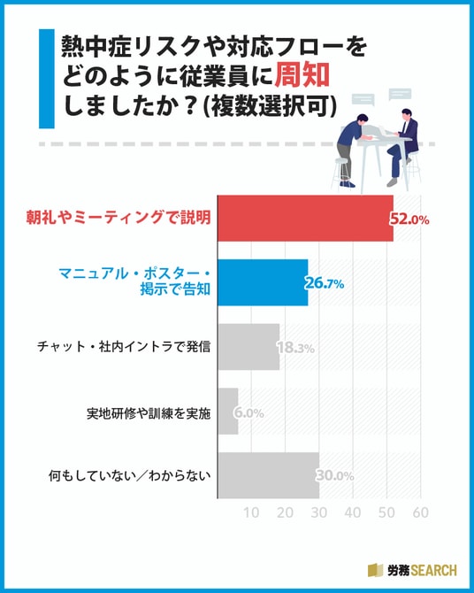 熱中症リスクや対応フローに周知方法について尋ねたところ、1位は「朝礼やミーティングで説明」で52.0%、2位は「何もしていない/わからない」で30.0%、3位は「マニュアル・ポスター・掲示で告知」で26.7%でした。半数以上が朝礼などの場で直接情報を伝えている一方で、3割は周知自体がおこなわれていないという実態が明らかになりました。