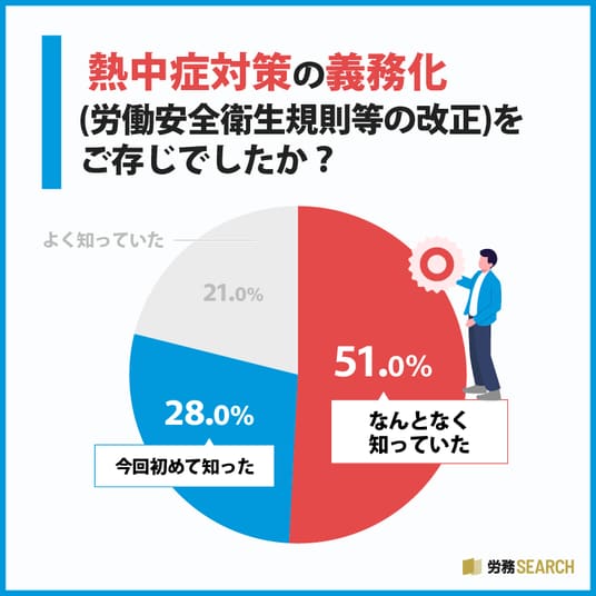 はじめに、熱中症対策の義務化(労働安全衛生規則等の改正)を知っているか尋ねたところ、「なんとなく知っていた」が51.0%で最も多く、次いで「今回初めて知った」が28.0%、「よく知っていた」が21.0%という結果になりました。