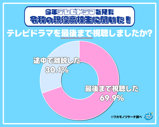 続いて、今年ドラマを見たという全国の現役高校生に、「テレビドラマを最後まで視聴しましたか?」というアンケート調査を実施したところ、