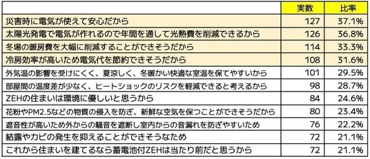 その結果「絶対に蓄電池付ZEH住宅したいと思う(している)」(24.5%)、「できれば蓄電池付ZEH住宅したいと思う(検討している)」(37.6%)となり、62.1%が「蓄電池付ZEH住宅」を支持しています。その理由は「災害時に電気が使えて安心だから(37.1%)」が最も多く、続いて「太陽光発電で電気が作れるので年間を通して光熱費を削減できるから(36.8%)」「冬場の暖房費を大幅に削減することができそうだから(33.3%)」「冷房効率が高いため電気代を節約できそうだから(31.6%)となりました。住まいの安全性を高める「災害時の電源確保」と物価高騰の中「光熱費の削減」の二つが、「蓄電池付ZEH住宅」を多くの方が求める要因であると判明しました。