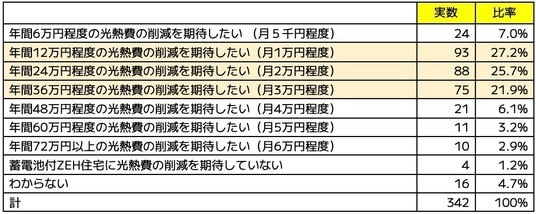 一方、蓄電池付ZEH住宅にする際に許容できるイニシャルコスト高としては、約100万円アップ(30.7%)、約200万円アップ(20.2%)となり、半数(50.9%)が約200万以内と回答しています。さらに蓄電池付ZEH住宅にしたとき、年間で削減したい光熱費の金額は、月1万円程度(27.2%)、月2万円程度(25.7%)、月3万円程度(21.9%)となり、月1万円から3万円の削減を求める回答が74.8%となっています。