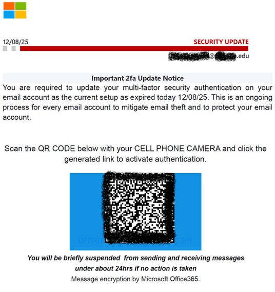 - 支払い更新詐欺:8月中、アメリカ国内の大学職員が「****** University-Pay Update.pdf(******大学-給与更新.pdf)」 というタイトルのPDFファイルを受け取りました。このドキュメントは受信者に対してQRコード経由でMFA設定を更新するように促し、アカウントの停止をほのめかしていました。実際には、悪意ある偽のMicrosoftログインページにリダイレクトされるものでした。