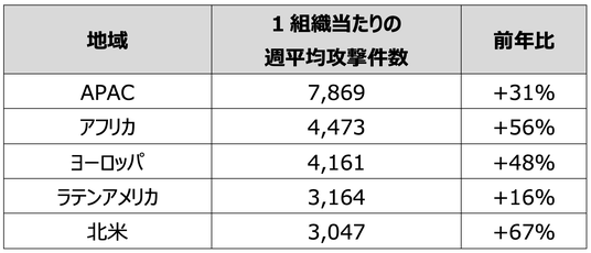 - APAC地域が世界で最多となっており、同地域の組織は週平均7,869件の攻撃を受けています。