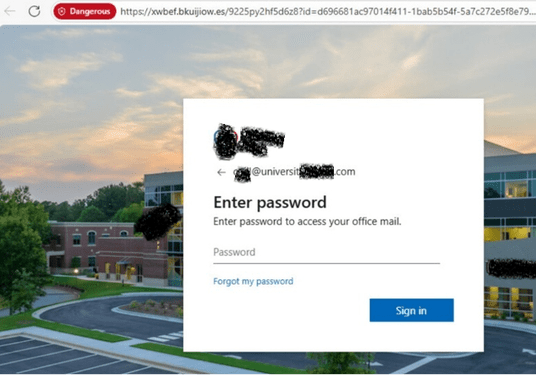 - 偽の大学ログインページ:8月12日、攻撃者は「[university_name].comVWAV.svg」という形式で学校や大学の名前を使ったファイル名のフィッシングメールを配信しました。被害者は、Microsoft Outlookを模倣して作成され、認証情報を窃取するように設計された偽の大学ログインページにリダイレクトされました。