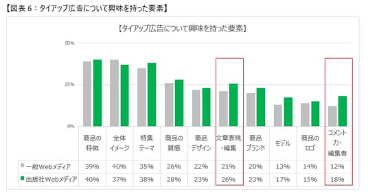 出版社Webメディアのタイアップ広告効果が高い理由について、「広告に興味を持った要素」を一般Webメディア全体平均と比べた場合、出版社Webメディアでは「文章表現・編集」や「コメント力・編集者」といった、雑誌編集の経験に裏打ちされた独自性や信頼性が高く評価されています。(図表6)