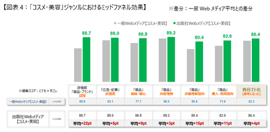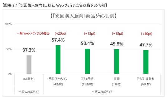 そして、出版社Webメディアについて広告素材のジャンル別で確認した場合も一般Webメディア平均を10pt以上上回っており、購買行動を後押しする広告施策であることが読み取れます。(図表3)