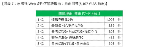 さらに、2024年~2025年の本調査で出版社Webメディアの閲読理由として寄せられた5,107件の自由回答では、「情報を得る」「最新のトレンドがわかる」「参考になる」といった価値が多く挙げられました。これらの結果から、広告に対するポジティブな受け止めの背景には、出版社Webメディアが長年培ってきた歴史に基づく信頼感が根付いていることがうかがえます。加えて、読者の関心や生活に寄り添うことで、意識向上に寄与する情報発信の場として、有効なコミュニケーション手段となっていると考えられます。(図表7)
