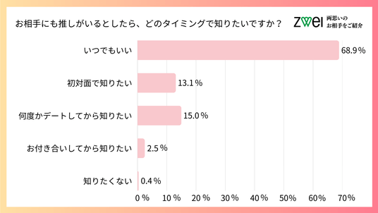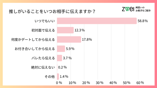 けれども今の時代、ZWEI(ツヴァイ)の調査では58.8%の人が「推しがいることはいつ伝えてもいい」と回答。さらに、恋人側としても68.9%が「知るタイミングはいつでも構わない」と寛容な姿勢を見せています。