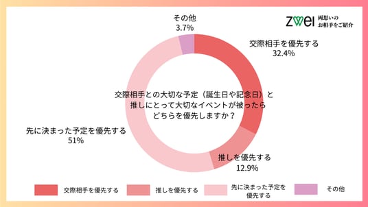 「結局は自分よりも推しを優先するのでは…?」というのは、推しがいる恋人を持つ側にとって不安なポイントかもしれません。調査では「推しのイベントと記念日が重なったらどうするか?」という質問に対して、51%が「先に決まった予定を優先する」と回答しました。