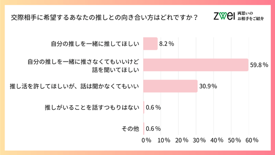 国内最多の成婚数を誇る株式会社IBJのグループ会社である株式会社ZWEI(本社:東京都中央区、代表取締役:橋爪 みずほ、以下「ZWEI(ツヴァイ)」)は、512名の男女に対して「推し活(応援)と恋愛の両立」をテーマにした独自アンケート調査を実施。その結果、推し活と恋愛の両立において、「共有はしても、強要はしないこと」が大切であるとわかりました。