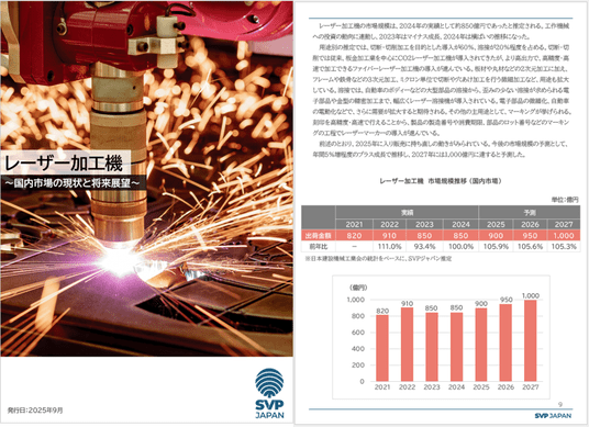 会員制マーケットリサーチサービスを提供している、株式会社SVPジャパン(本社:東京都中央区、代表取締役社長:橋本 雅、以下「SVPジャパン」)は、本日、SVP注目市場分析レポート「レーザー加工機-国内市場の現状と将来展望-」を、会員企業向けに公開いたしました。