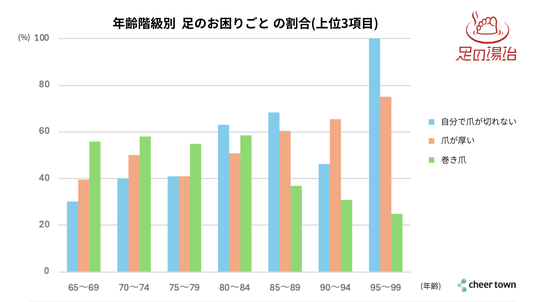 年齢別に「上位3項目の”足のお困りごと”の割合」を出しています。グラフから、「巻き爪」は84歳までは高い割合を示していますが、年を重ねるにつれ「厚い爪」が増え、そして「自分で切れなくなる」割合が増えています。