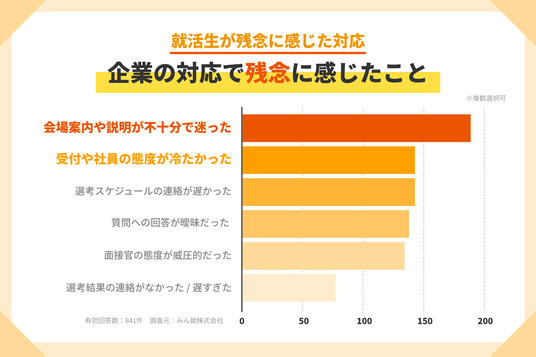 一方で、「残念に感じたこと」としては、「会場案内や説明が不十分で迷った」(193件/22.9%)が最多でした。また、「受付や社員の態度が冷たかった」(146件/17.4%)、「選考スケジュールの連絡が遅かった」(146件/17.4%)なども多く挙げられ、基本的な対応や情報提供の質が就活生の不満に繋がっていることが示されました。自由記述からは、「声が小さくて聞き取りづらかった」「サイレントで面接結果を言わない」といったコミュニケーション不足や、連絡の遅延に対する不満が多く見受けられました。また、「圧迫面接」「社員同士の声が大きい」など、会場での態度や配慮の欠如も残念な印象を与える要因となっていることが明らかになりました。
