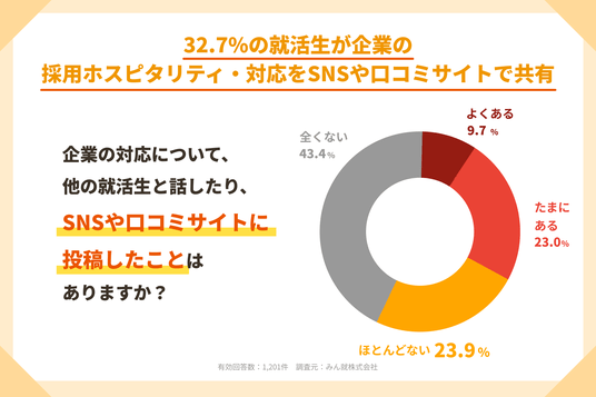 企業の対応について、「他の就活生と話したり、SNSや口コミサイトに投稿したことがあるか」という質問に対して、「よくある」と回答した就活生は9.7%、「たまにある」は23.1%となり、合わせて32.7%が自身の体験を共有していることが分かりました。