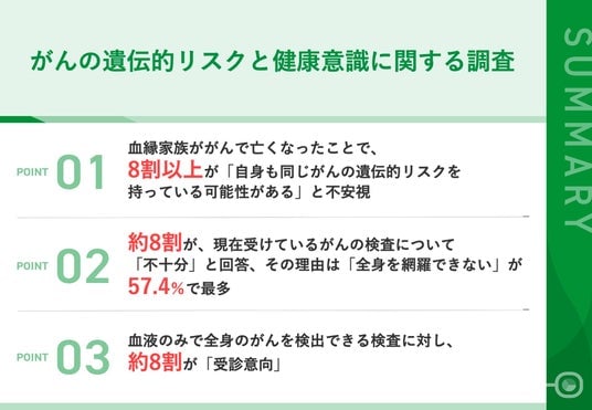 - 01|血縁家族ががんで亡くなったことで、8割以上が「自身も同じがんの遺伝的リスクを持っている可能性がある」と不安視