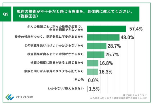 Q4で「非常にそう思う」「ややそう思う」と回答した方に、「Q5.現在の検査が不十分だと感じる理由を、具体的に教えてください。(複数回答)」(n=202)と質問したところ、「がんの種類ごとに別々の検査が必要で、全身を網羅できないから」が57.4%、「検査の頻度が少なく、早期発見に不安があるから」が48.0%という回答となりました。