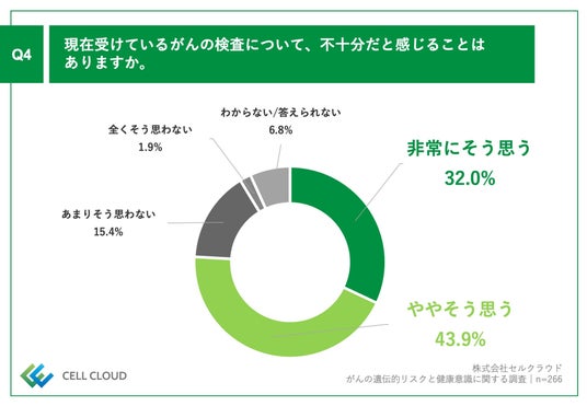 Q3で「特に何もしていない」以外を回答した方に、「Q4.現在受けているがんの検査について、不十分だと感じることはありますか。」(n=266)と質問したところ、「非常にそう思う」が32.0%、「ややそう思う」が43.9%という回答となりました。