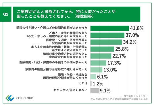 「Q2.ご家族ががんと診断されてから、特に大変だったことや困ったことを教えてください。(複数回答)」(n=330)と質問したところ、「通院の付き添い・介護などの時間的負担が大きかった」が41.8%、「ご本人・家族の精神的な負担(不安・悲しみ・睡眠の乱れ等)が大きかった」が37.0%という回答となりました。