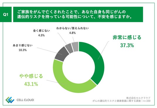 「Q1.ご家族をがんで亡くされたことで、あなた自身も同じがんの遺伝的リスクを持っている可能性について、不安を感じますか。」(n=330)と質問したところ、「非常に感じる」が37.3%、「やや感じる」が43.1%という回答となりました。