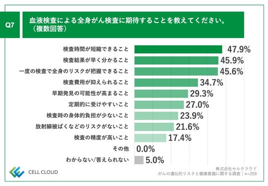 Q6で「非常にそう思う」「ややそう思う」と回答した方に、「Q7.血液検査による全身がん検査に期待することを教えてください。(複数回答)」(n=259)と質問したところ、「検査時間が短縮できること」が47.9%、「検査結果が早く分かること」が45.9%という回答となりました。