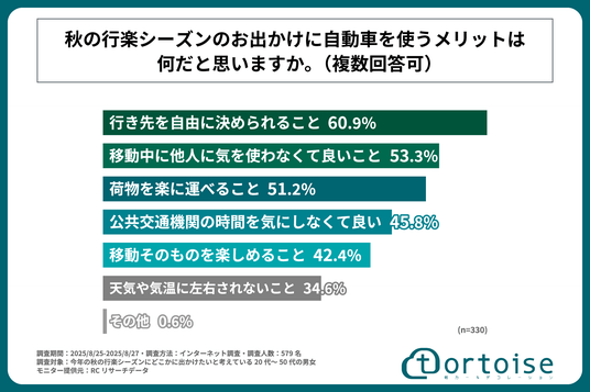 調査の最後、今年の秋の行楽シーズンに出かける際に、車を主に使用したいと回答した人を対象に「秋の行楽シーズンのお出かけに自動車を使うメリット」を尋ねる設問への回答では、1位が「行き先を自由に決められること」で60.9%、2位が「移動中に他人に気を使わなくて良いこと」で53.3%、3位が「荷物を楽に運べること」で51.2%という結果になりました。この結果から、秋の行楽シーズンに車で出かける主なメリットは、「行き先を自由に決められること」や「移動中に他人に気を使わなくて良いこと」であることが明らかになりました。