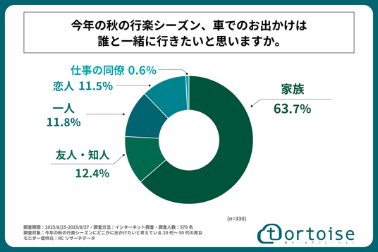 また、今年の秋の行楽シーズンに出かける際に、車を主に使用したいと回答した人を対象に「今年の秋の行楽シーズン、車でのお出かけは誰と一緒に行きたいか」を尋ねる設問への回答では、1位が「家族」で63.7%、2位が「友人・知人」で12.4%、3位が「一人」で11.8%という結果になりました。この結果から、今秋の行楽シーズンに車で一緒に出かけたいと思う相手で最も多いのは、「家族」であることが明らかになりました。