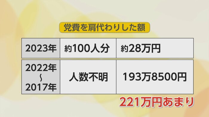 氷見市支部のこれまでの説明によりますと、党費を肩代わりした額は2023年に28万円、2017年から2022年までの間に193万円あまりのあわせて、少なくとも221万円あまりです。