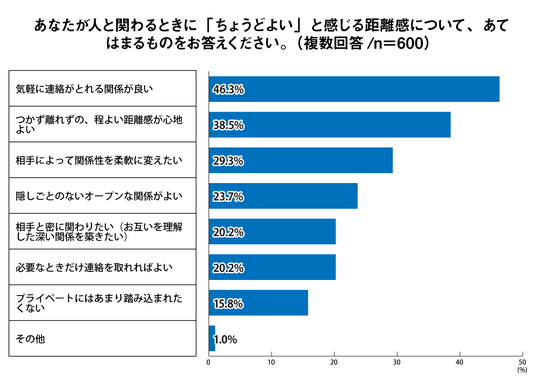 回答率が最も高いのは、「気軽に連絡がとれる関係がよい」で46.3%でした。次いで「つかず離れずの、程よい距離感が心地よい」が38.5%、「相手によって関係性を柔軟に変えたい」が29.3%、「隠しごとのないオープンな関係がよい」が23.7%と続きました。