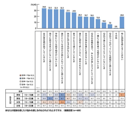 最も高いのは「自己肯定感が低下しているとき」で34.0%でした。次いで「周りに話せる友人がいないと感じたとき」が32.5%、「学校にいても話す相手がいないとき」「誰かといても自分だけ話に入れていないと感じるとき」がそれぞれ32.3%と続きました。