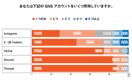 SNSのアカウントに関して、「Instagram」は70%以上が、「X(旧Twitter)」も過半数が2つ以上と回答しました。