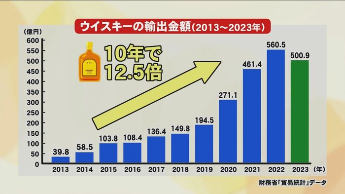 日本のウイスキー、いわゆる『ジャパニーズウイスキー』が著名なコンテストで賞を取るなど、世界中で高い評価を受けている。ウイスキーをテーマにしたドラマやハイボール人気も追い風となり、ウイスキーの輸出金額は2013年に約40億円だったが、2023年には500億円と、10年で12.5倍の伸びを見せている。