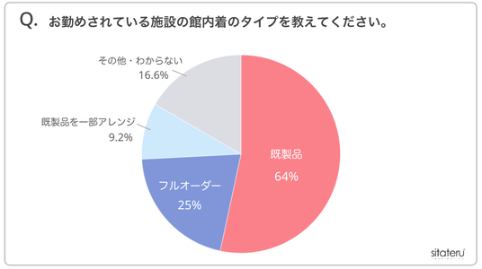 1.6割以上の施設が館内着は既製品を利用。「Q.お勤めされている施設の来客用館内着のタイプを教えてください。」と質問したところ、「既製品」が64%、「フルオーダー」が25%という回答となりました。