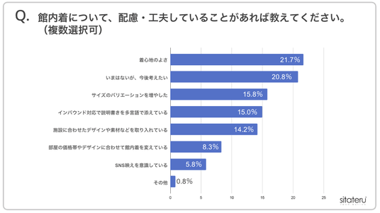 「Q.来客用の館内着について、配慮・工夫していることがあれば教えてください。(複数選択可)」と質問したところ、「着心地の良さ」が21.7%、「いまはないが、今後考えたい」が20.8%という回答となりました。