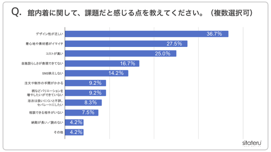 「Q.館内着に関して、課題だと感じる点を教えてください。(複数回答)」と質問したところ、「デザイン性が乏しい」「着心地や素材感がイマイチ」という回答が上位となりました。