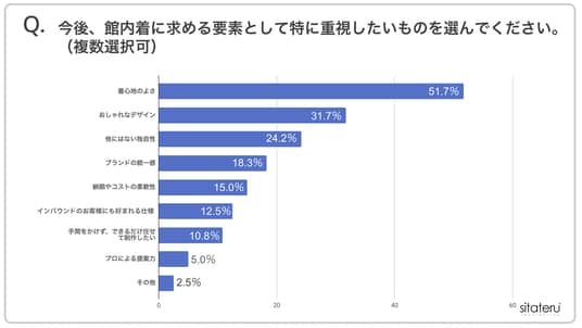 「Q.今後、館内着に求める要素として特に重視したいものを選んでください。」と質問したところ、「着心地のよさ」が51.7%、「おしゃれなデザイン」が31.7%という回答となりました。