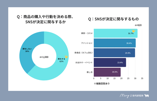 また、「SNSが決定に関与するもの」についての質問では、「美容・コスメ」(31.7%)、「ファッション」(30.4%)、「飲食店(カフェ含む)」(29.9%)がいずれも約3割の票を獲得する結果となった。