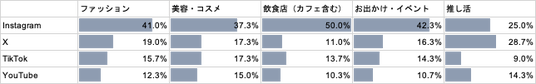 続いて、「情報収集をするのに最も使っているアプリ・サービス」についてカテゴリごとに聞いたところ、推し活は「X」が1位で、その他のカテゴリはいずれも「Instagram」が最も多い結果となった。