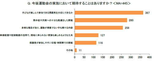 「今後の運動会に期待することはありますか?<MA>」と尋ねると、8割以上の親が「子どもが楽しんで参加できる雰囲気を大切にできるか」(367)と回答しました。その他にも、「熱中症や天候への十分な配慮をした開催」(280)、「多様な種目があり、運動が得意でない子も輝ける内容」(258)にも多くの回答が集まり、親たちが運動会に求める本質は、安全面だけでなく、子どもたちが普段の授業とは異なる経験や学びを、楽しみながら得られることだと読み取れます。
