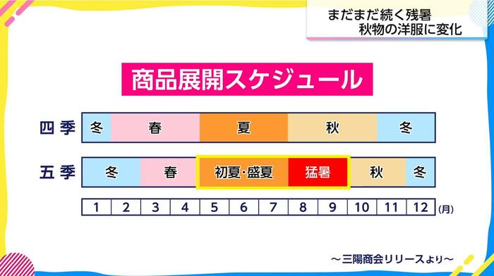 「五季」とは、春、秋、冬に加え、夏の期間を拡大し、5月から7月を「初夏・盛夏」、8月と9月を「猛暑」とすることで「五季」となる。三陽商会によると、「五季」と捉えることで、半袖など夏の洋服を売る期間が増え、顧客のニーズに合った商品展開ができるという。