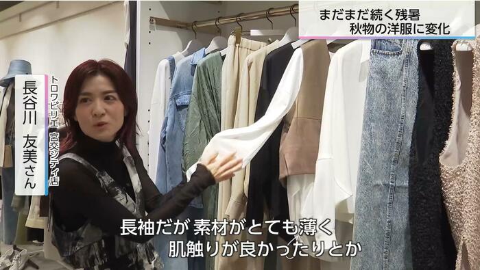 宮崎市で年間真夏日数が過去最多を記録するなど、厳しい残暑が続いている。アパレルショップでは秋物が店頭に並ぶが、この10年で商品の変化が見られるという。「薄手の長袖」「涼しげなニット」など、残暑の中でも快適に着用できるアイテムが増加している。大手アパレルメーカーでは季節を「四季」ではなく「五季」と捉え、商品展開を行う動きも出ている。