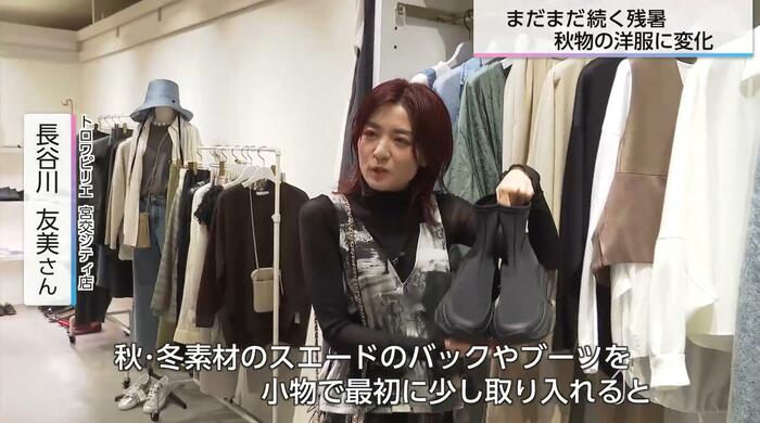 約30ブランドの商品を扱うセレクトショップ「トロワピリエ」では、8月から秋物が並び始め、現在はほぼ全商品が秋物に入れ替わっている。アパレル店員歴17年の長谷川友美さんは、この10年で秋物の商品に変化が見られると話す。
